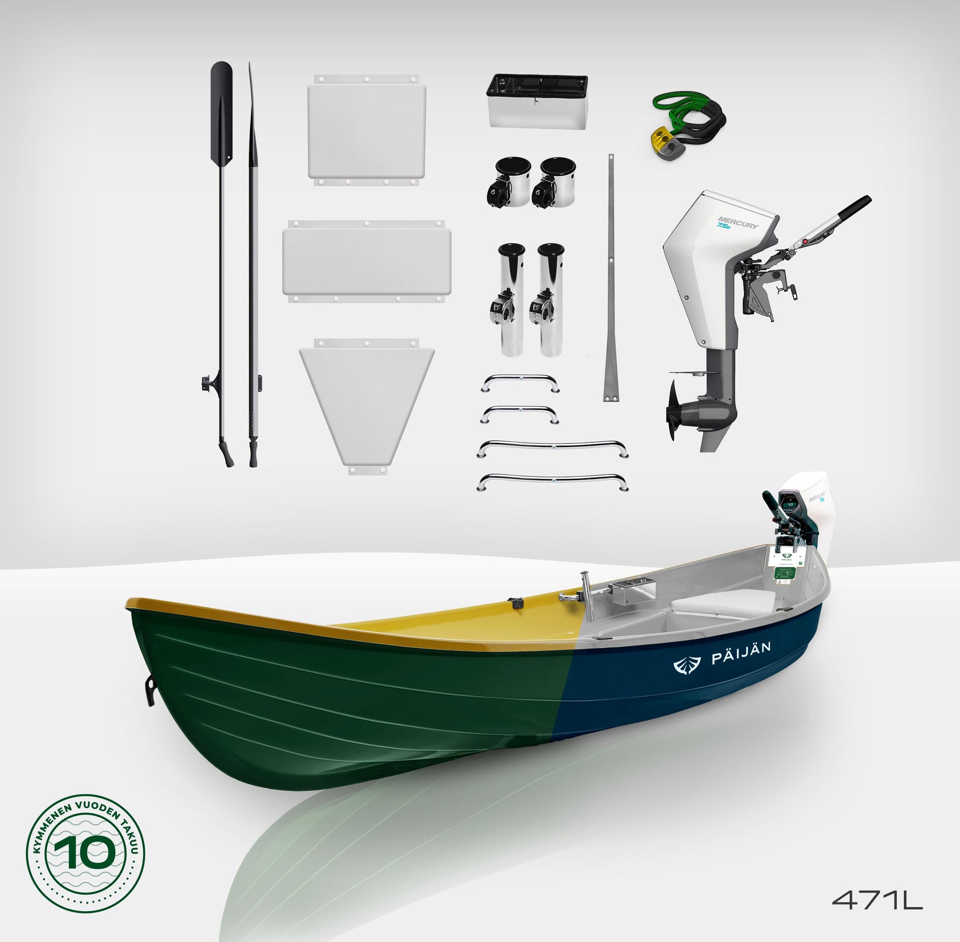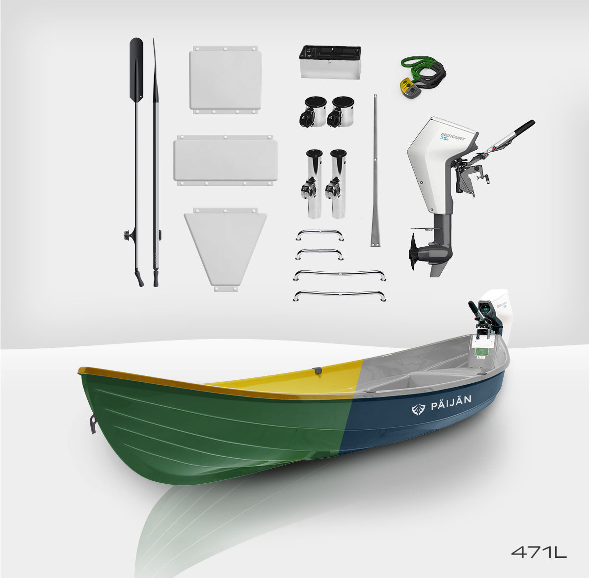 Be silent and drive electric. Now Päijän 471L with amazing Mercury Avator 7.5 e electric engine at a special package ready to be delivered to your shore. This package has a Päijän stainless steel rails at bow and stern, rod, can and equipment holders attached to rails, Aerot® oars, Snubber shore towing rope and crash bar ready installed. This boat fulfills all your summer boating desires silently and smoothly.