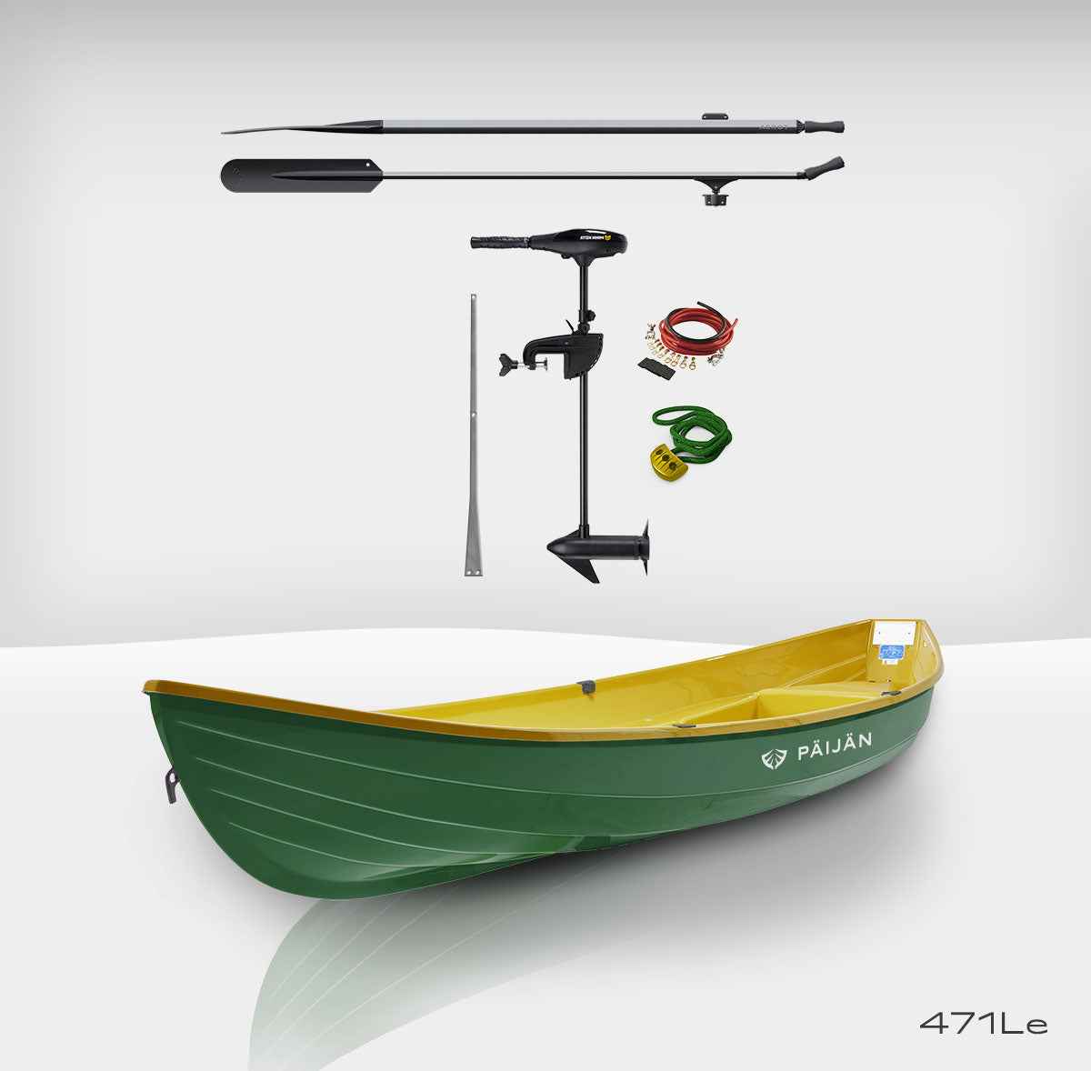 Behåll lugnet, kör på el. Päijän 471L är en roddbåt med en elektrisk utombordsmotor. Båten har kabelgenomföringar i skrovet från aktern till det mellersta förvaringsutrymmet. Päijän 471L är vår välbekanta klassiska modell, som har kompletterats med förvaringsfack i fram- och mittbänkarna.